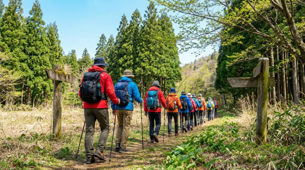 塩の道トレイルはコースによって難易度が大きく異なります。基本装備としては、トレッキングシューズ(滑りにくいソールのもの)、ゴアテックス素材などの防水性の高い雨具、日差し対策と防寒を兼ねた帽子、藪や虫対策のための長袖シャツと長ズボンが必要です。飲料水については、山岳エリアは補給ポイントが少ないため十分な量を携行してください。公式マップや地図、コンパスの携行も推奨されます。特に山岳エリアは熊の出没地帯として知られているため、熊鈴は必携です。単独行動を避け、安全に配慮した歩き方が求められます。