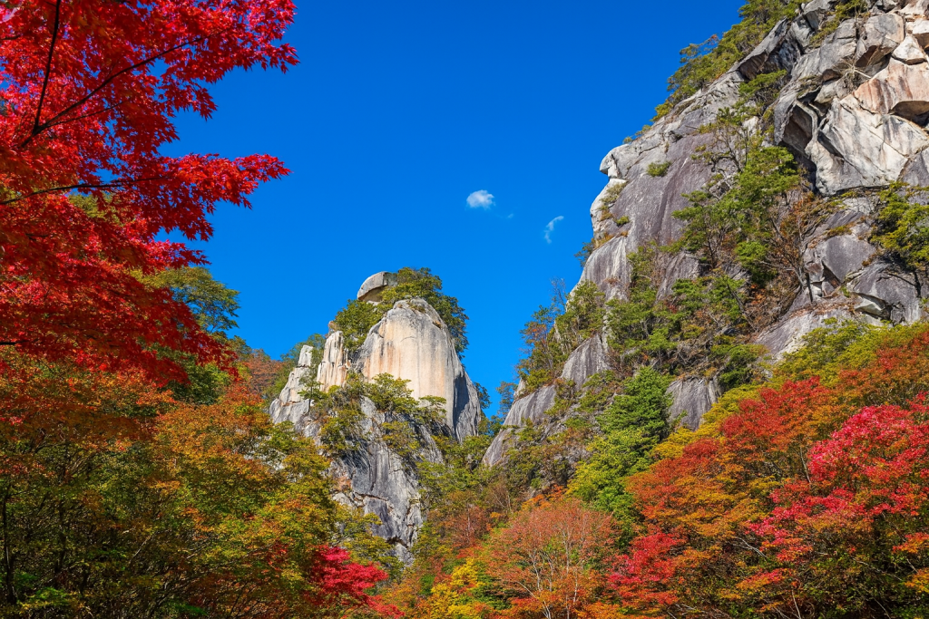 遊歩道散策が紅葉を楽しむ基本的な方法です。特に渓谷沿いにある遊歩道から見る紅葉は絶景で、清流の音を聞きながら色鮮やかな紅葉を眺める体験は、日常の喧騒を忘れさせてくれます。覚円峰では紅葉のシーズンにはまるで覚円峰を引き立てるように紅に染まったパノラマの景色を見ることができます。仙娥滝は日本の滝百名選に選出されている落差約30メートルの滝で、紅葉との組み合わせが美しい景観を作り出します。白い水しぶきと赤や黄色の紅葉のコントラストは、まさに絵画のような美しさです。